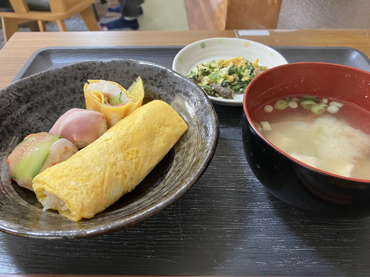 本日の昼食は薄焼き卵で巻いた恵方巻と、手まり寿司でした。