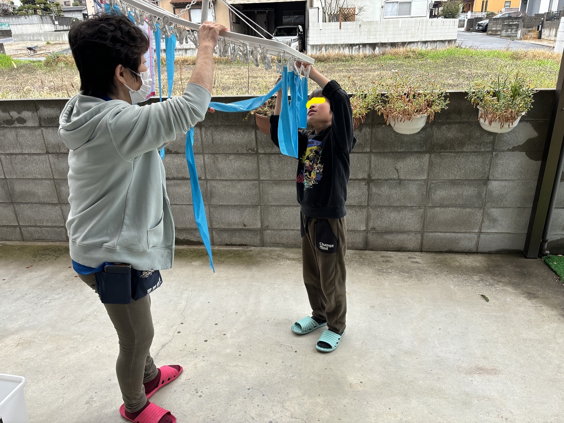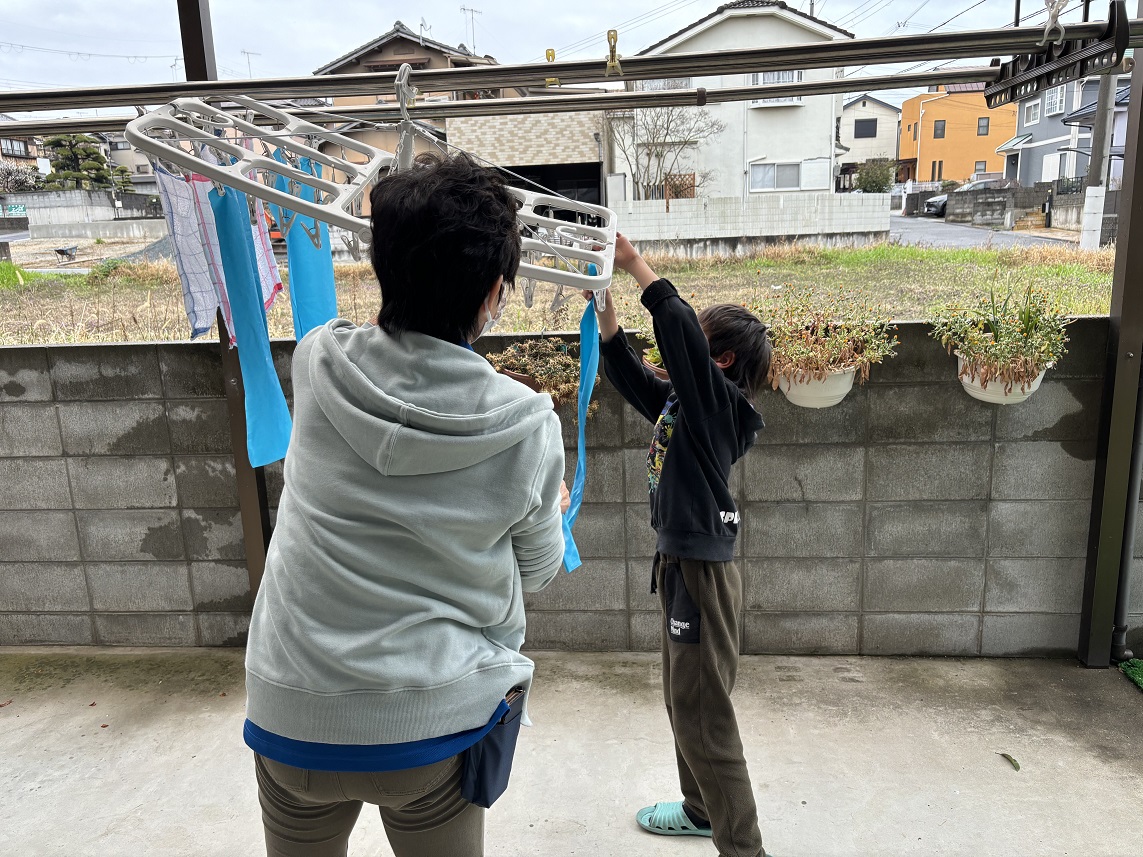 地面に着かないように考えて助言もなしにうまいこと干してくれました。お直しは必要ですが、やってくれたという気持ちが嬉しいですね(*^▽^*)去年の今頃なら手伝ってと言ってもほとんどしてくれませんでしたが・・・これが成長というやつですね!