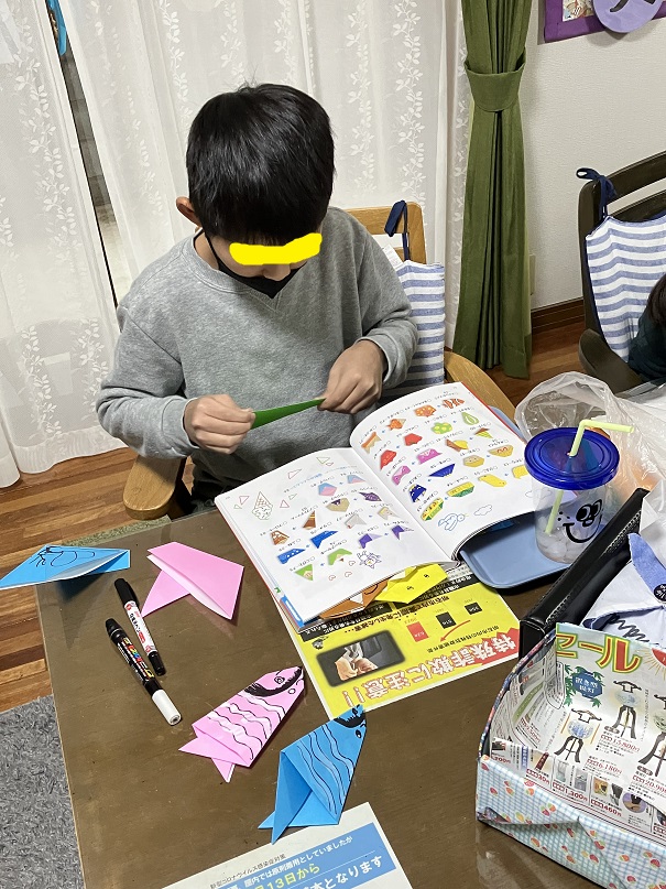 学校の図書室から借りてきた本をみながら折り紙に熱中しています。