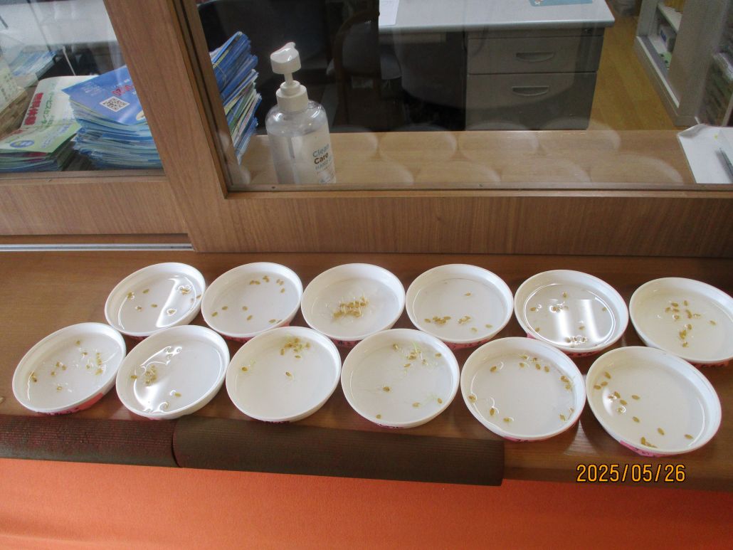 種もみを頂いたので、児童全員、お皿に分け合って水に浸して芽が出るのを待ちました。