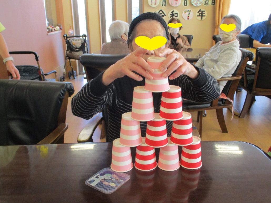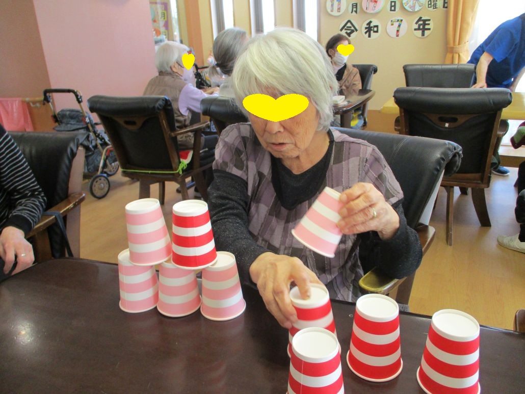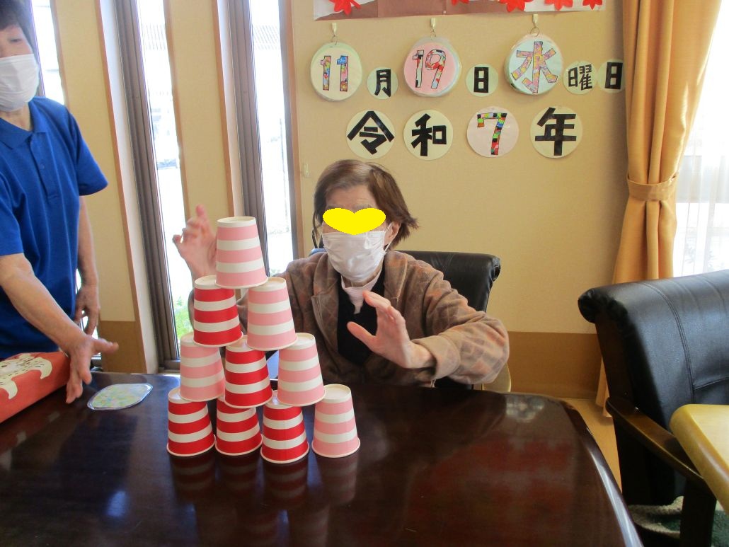 次は、紙コップ10個をピラミッドのように積み上げていただきました。