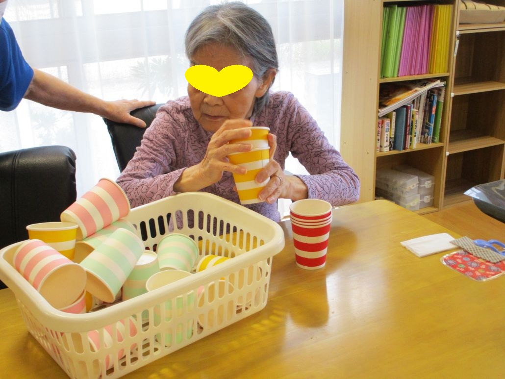 最初は、バラバラに入った紙コップを色ごとに集めていただきました。
