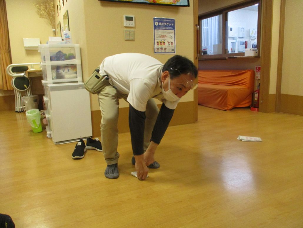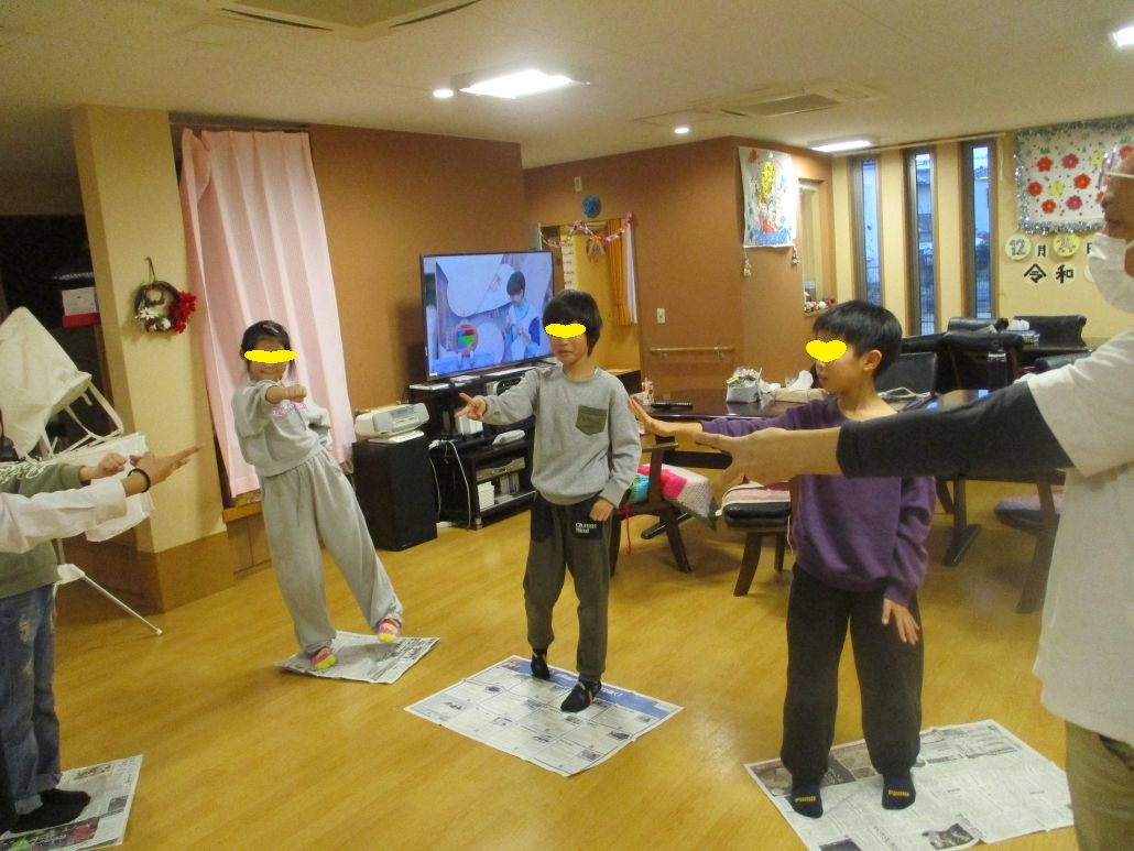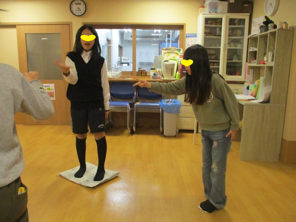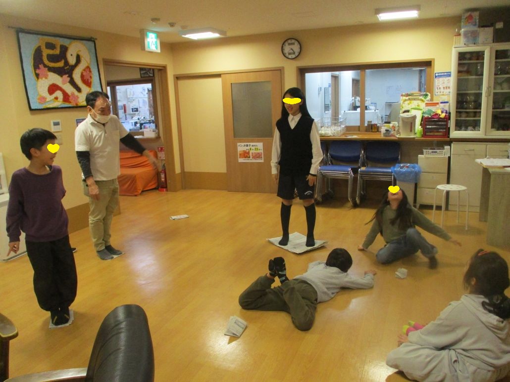 おやつの時間までは、それぞれのやりたいことをして過ごしました。おやつを食べ終わると、新聞じゃんけんというゲームが始まりましたよ!新聞紙を一枚床に置き、上に乗ります。
