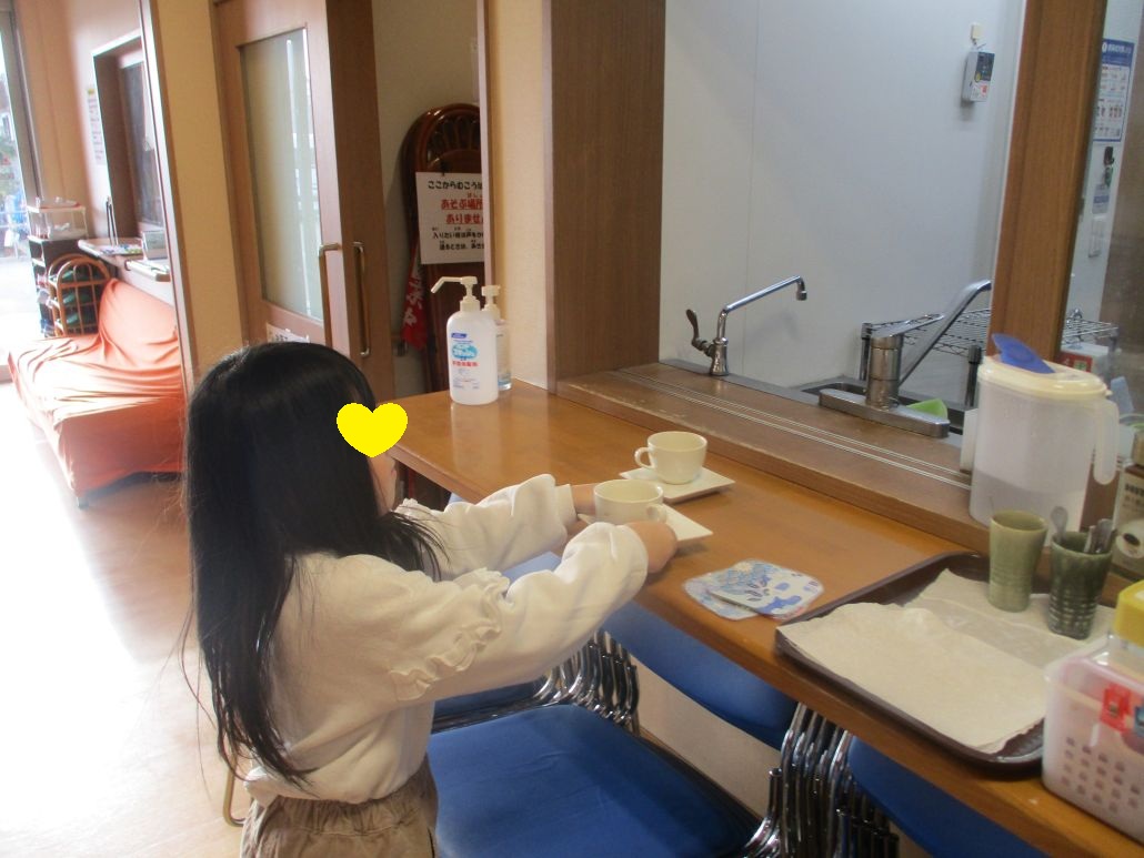 そして、高齢者様が帰った後のフロアでは、高齢者様のおやつのコップとお皿を片付けてくれる児童がいました。