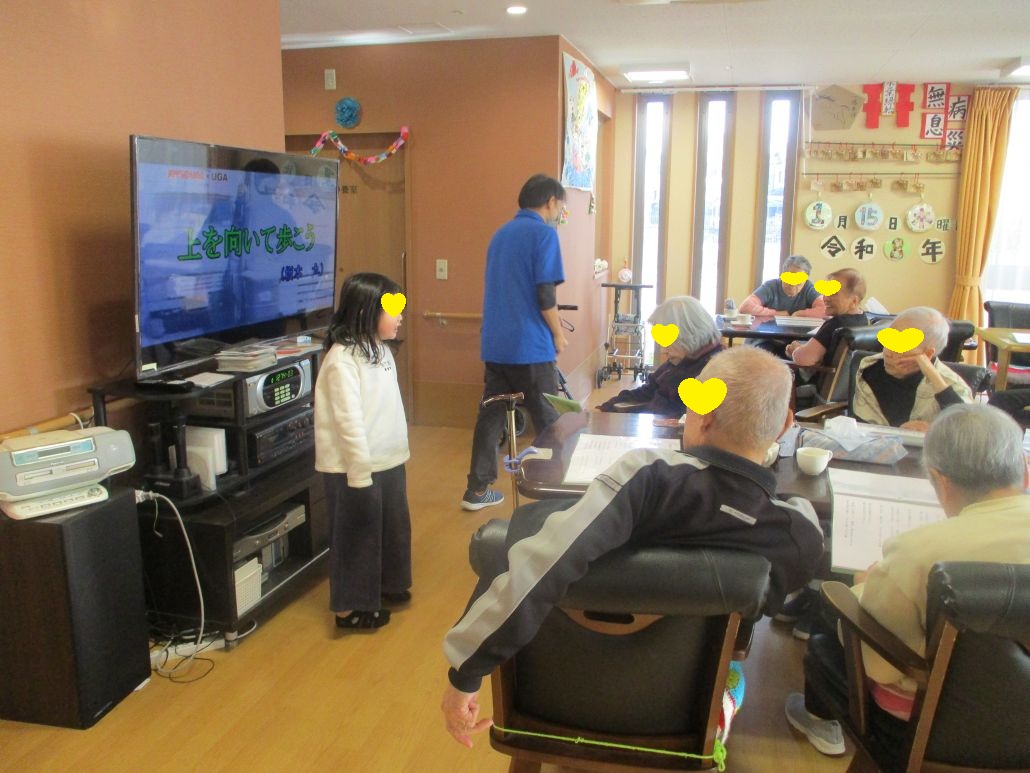 今日は、1人の児童が高齢者様の前に立ち、「今から、今月の歌を唄います!」と、カラオケの番号を入れてくれました!