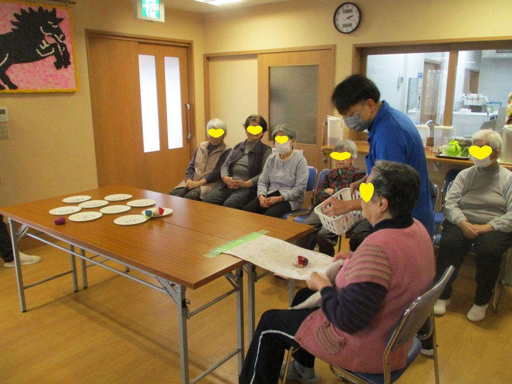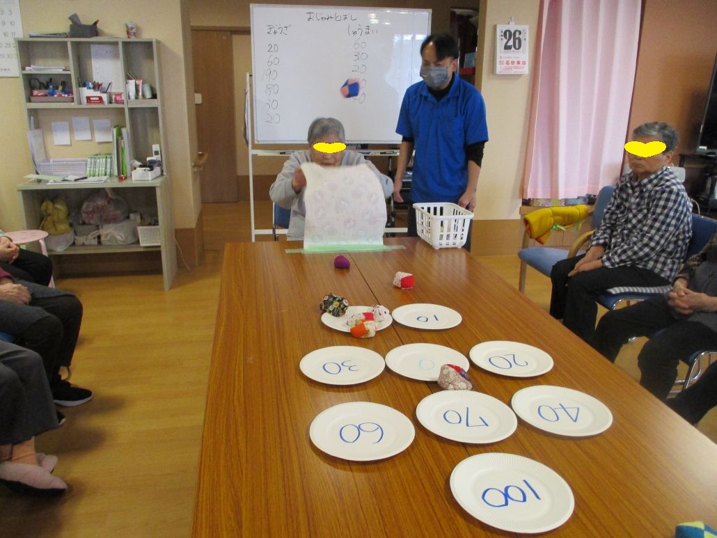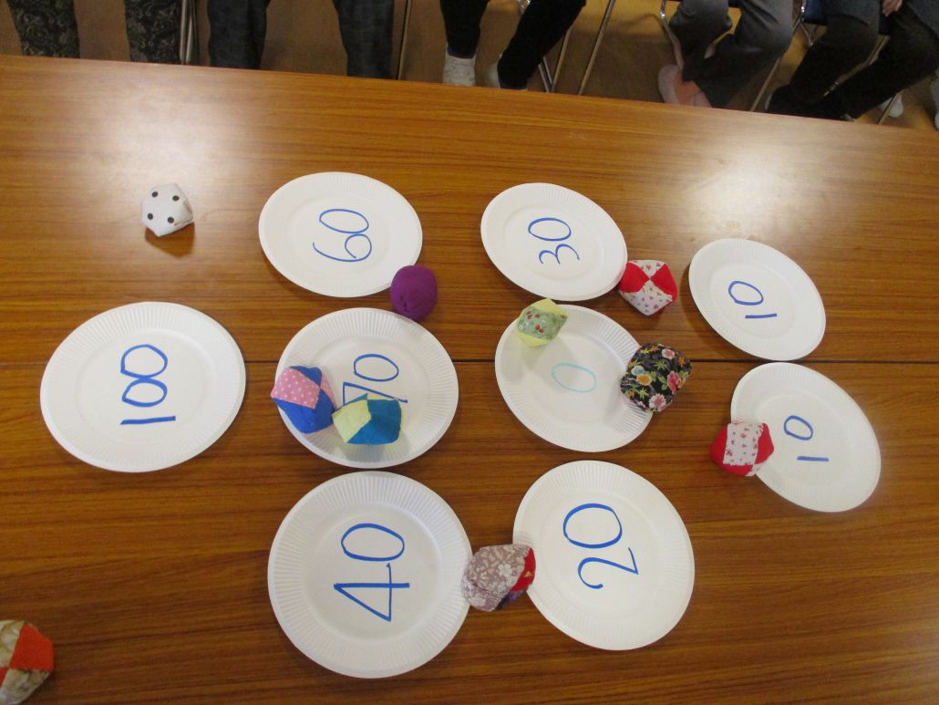 タオルでおじゃみを飛ばして、点数の書いてある紙皿に乗せます!