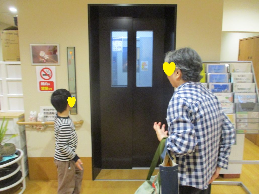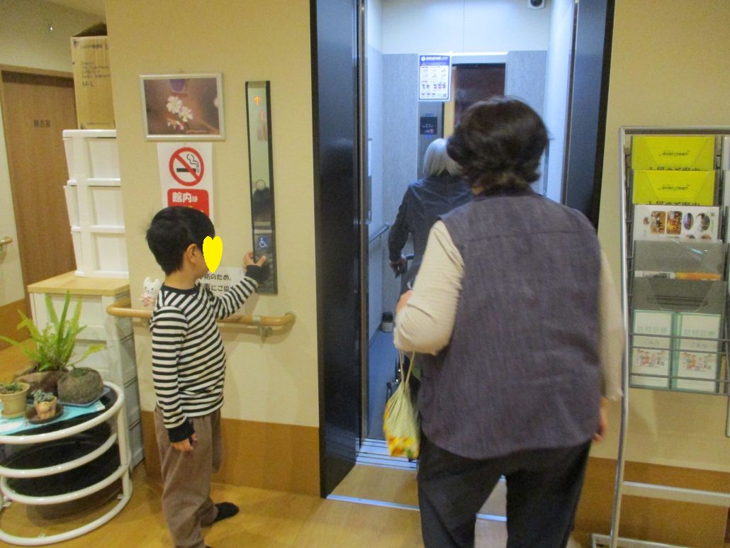 高齢者様のデイサービスが終わると、「行っていまーす!」とエレベーターに・・・